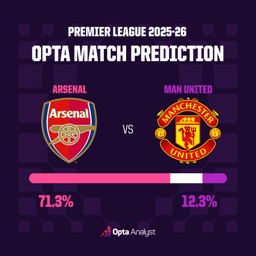 Nhận định trên cũng trùng khớp với dự đoán từ siêu máy tính Opta. Sau 10.000 lần mô phỏng trước trận, Arsenal được xem là đội chiếm ưu thế rõ rệt khi sở hữu tới 71,3% khả năng giành trọn 3 điểm. Trong khi đó, cơ hội chiến thắng của Man Utd chỉ dừng lại ở mức 12,3%, còn khả năng hai đội bất phân thắng bại rơi vào khoảng 16,4%.